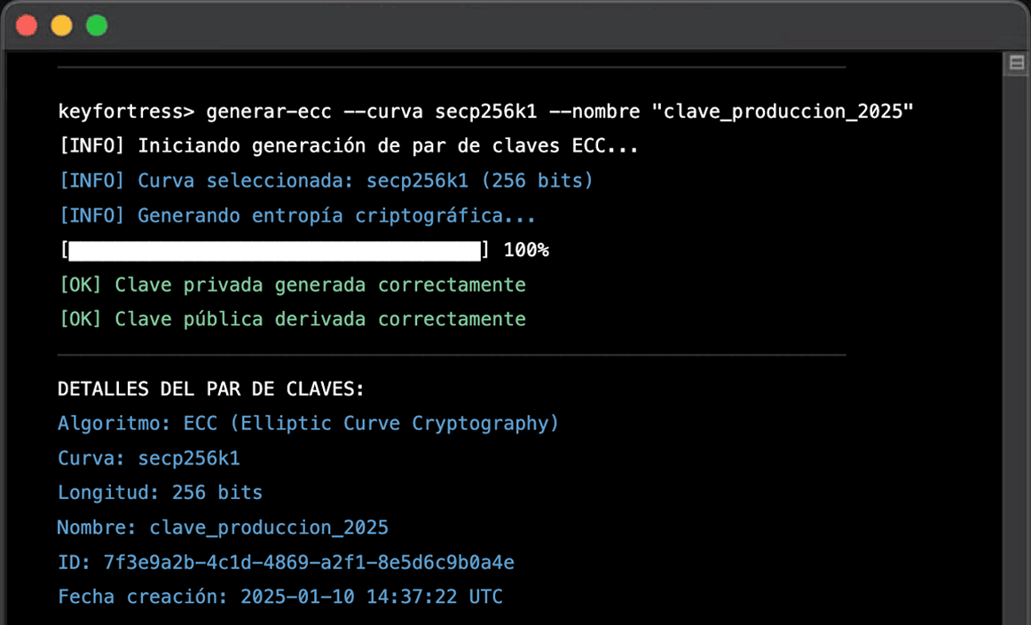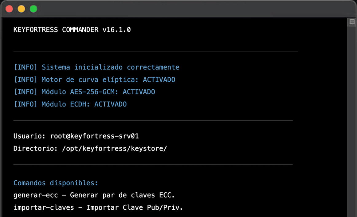 KeyFortress Commander ECIES cifra datos de forma que solo el destinatario autorizado pueda descifrarlos, aprovechando las ventajas de seguridad de las curvas elípticas (claves más cortas que RSA con el mismo nivel de seguridad) junto con la eficiencia del cifrado simétrico.