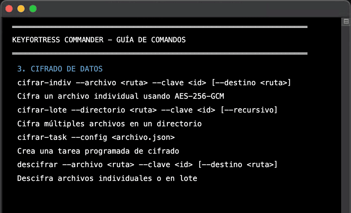 - Algoritmos de cifrado simétrico: Soporte para cifrar datos con AES-256-GCM (cifrado autenticado integrado o AEAD).